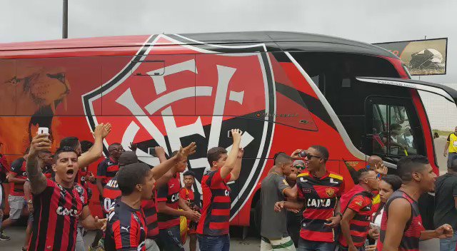 Corredor rubro-negro! Torcida do Vitória incentiva atletas antes da chegada do ônibus do clube ao Barradão. #SouMaisVitória#FechadoComOLeão